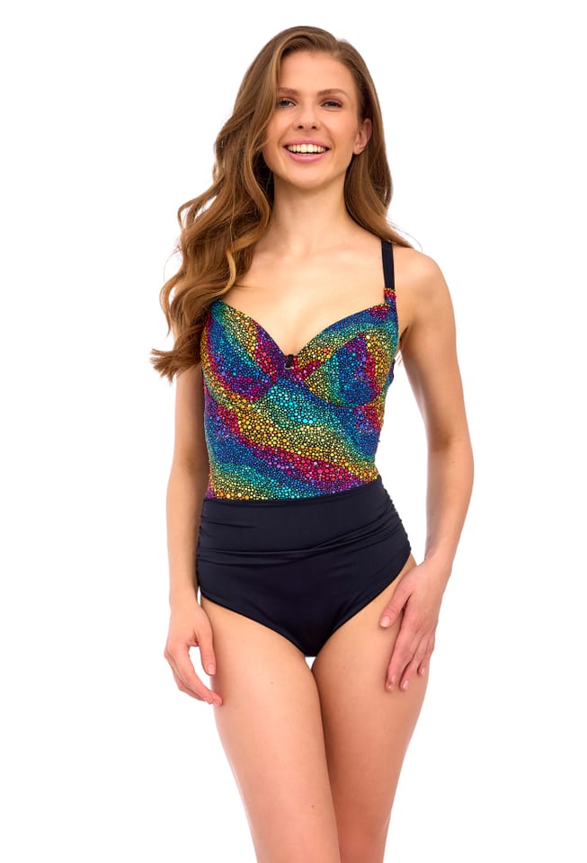 Jednoczęściowy kostium z kolekcji 2025, wykonany z dzianiny w czarnym kolorze oraz w kolorowe kropeczki imitujące tęczę, doskonały do użytku zarówno na plażę jak i na basen. Fason stroju łączy funkcjonalność oraz elegancję. Kostium posiada wszyty biustonosz z miękkimi miseczkami na fiszbinach oraz regulowane, nieodpinane ramiączka. Część majteczkowa wykonana z czarnej lycry. Tył kostiumu zapinany na klamrę. Skład surowcowy: 85% Poliamid, 15% Elastan