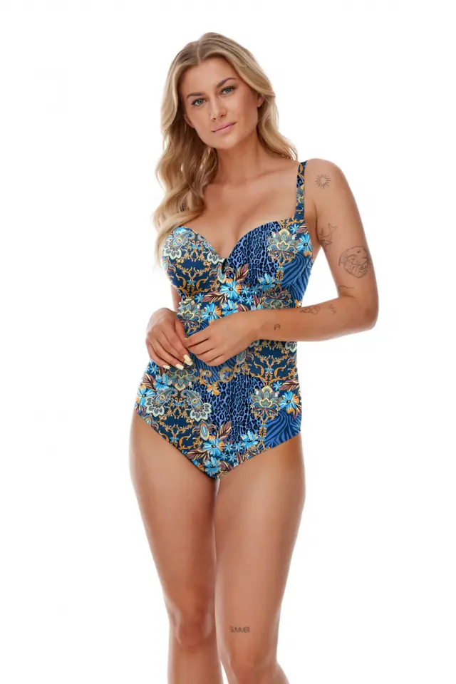 Jednoczęściowy kostium wykonany z dzianiny w stylu Versace w niebieskim odcieniu. Stworzony dla kobiet o pełniejszych kształtach, doskonały do użytku zarówno na plażę jak i na basen. Fason stroju łączy funkcjonalność oraz elegancję.