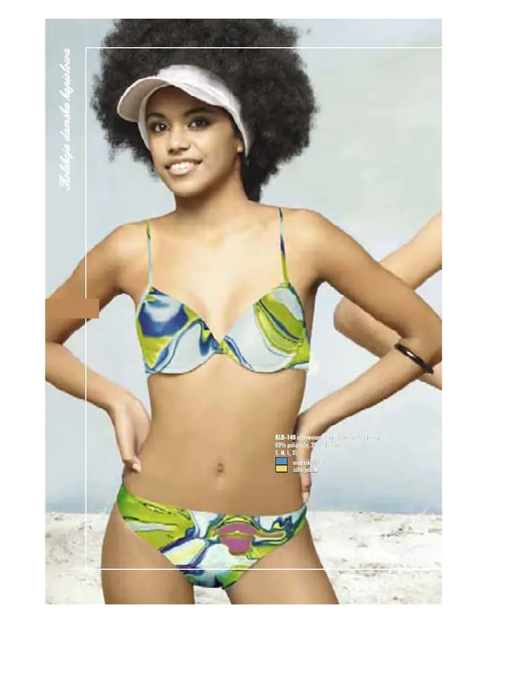 Dwuczęściowy kostium kąpielowy, uszyty z miękkiej, kolorowej dzianiny.