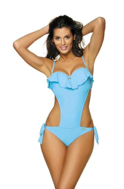 Bardzo seksowny, jednoczęściowy kostium kąpielowy typu monokini z brazylijskim tyłem. Gładki, z małą, złotą, biżuteryjną kokardką przy dekolcie i fikuśną falbaną w najmodniejszym obecnie, kubańskim stylu. Kobiecy, finezyjny, zmysłowy... Powitaj jeden z najgorętszych modeli tego sezonu!