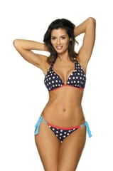 Biustonosz z dekoltem typu halter neck a'la Marylin Monroe, usztywniany i z bocznymi fiszbinami, świetnie zbiera piersi, modeluje je i pięknie prezentuje dekolt. Stylistyka urocza, kobieca, delikatna, acz z charakterem. Ramiączka wiązane na szyi, obwód zapinany na plecach na klamerkę. Figi idealnie dopasowane do biustonosza, wiązane po bokach na kokardki, w soczystym kolorze. Wspaniale zdobią biodra, dają sporą wygodę, bowiem mają fajny, biodrówkowy fason. Idealny strój dla kobiety, która chce po prostu świetnie wyglądać na plaży.