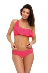 W komplecie znajduje się biustonosz wiązany na plecach, który imituje top na jednym ramiączku. Dekolt z dużą, zwiewną falbaną, wykonaną z lekkiej, włoskiej tkaniny, wygląda fenomenalnie. Piękna, wakacyjna kolorystyka. Biustonosz jest bez fiszbin, posiada profilowane, ukryte po wewnętrznej stronie wkładki modelująco-usztywniające piersi, dzięki nim biust wygląda atrakcyjnie. Wkładki można wyjąć z modelu, tworząc tym samym wersję "soft" biustonosza. Figi w bardzo dobrej wysokości, są bardzo wygodne i do tego zdobione kuszącymi pęknięciami po bokach. Skład: 80% poliamid, 20% elastan.