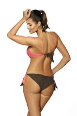 Biustonosz o usztywnianych miseczkach, z fiszbinami i wypełnieniem push up, wbudowanym na stałe do modelu. Świetnie unosi piersi, modeluje je i kusząco powiększa, co zresztą widać na zdjęciu. Strapsy (paski-gumki) są elastyczne, z biżuterią w złotym kolorze i mega modne. Dodają prawdziwego seksapealu, na który śmiało można sobie pozwolić na plaży. Ramiączka o regulowanej długości, nieodpinane. Obwód elastyczny, wiązany na plecach. Figi typu brazylijskiego, wysoko wycięte na pośladkach - seksowne i idealne do opalania. Aby uzyskać pełen, brazylijski efekt figi należy znacząco pociągnąć ku górze bioder. Po bokach wygodne wiązania. Ps. Figi z tyłu mają dodatkowe marszczenie na tkaninie, które optycznie zmysłowo zaokrągla pupę.