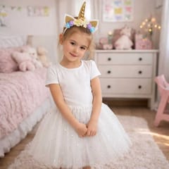 Strój karnawałowy opaska jednorożca i biała spódniczka księżniczki pokryta błyszczącymi gwiazdkami.