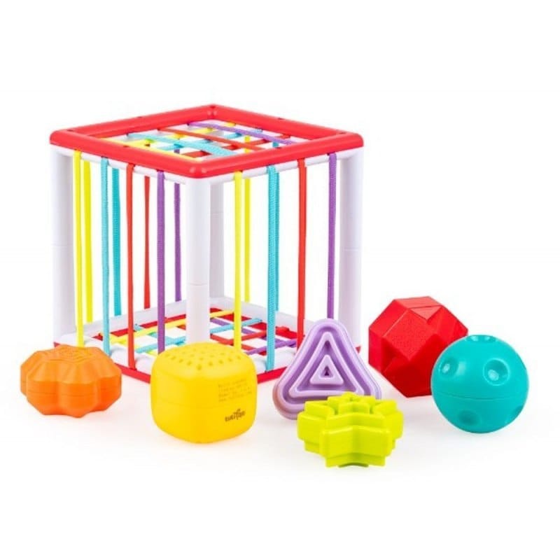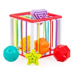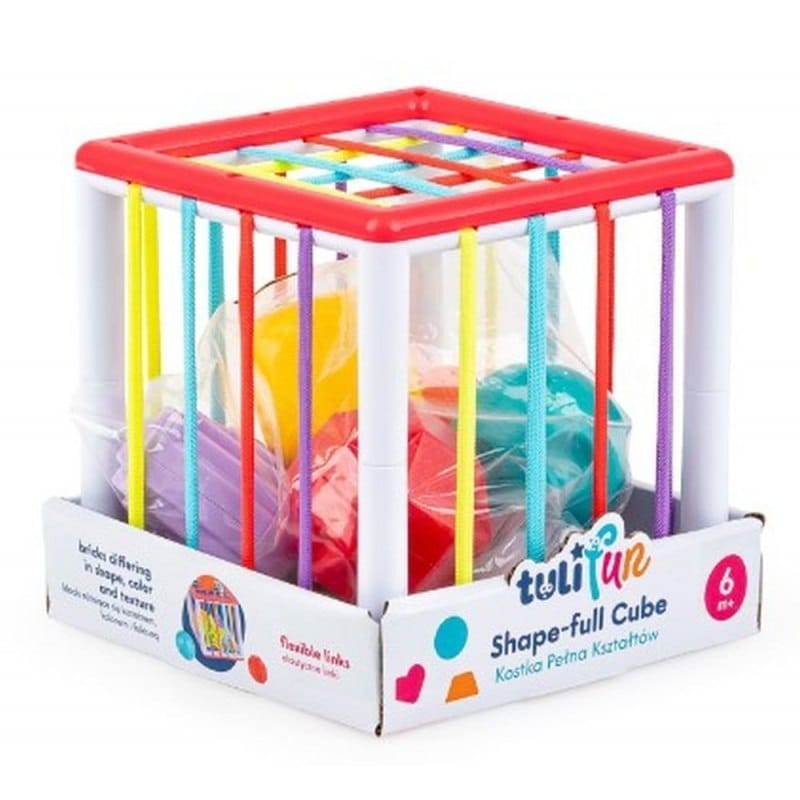 Kostka Pełna Kształtów Kostka z elastycznymi ściankami kryje w swym wnętrzu całą gromadkę kolorowych klocków! Ta inspirująca zabawka pozwoli najmłodszym odkrywcom poznać różnice pomiędzy poszczególnymi kształtami klocków, ich kolorem, a także fakturą. Poza stymulowaniem zmysłu wzroku i dotyku, zabawka oddziałuje także na zmysł słuchu maluchów, a to za sprawą grzechotania, które bobas usłyszy za każdym razem, gdy potrząśnie którymś z klocków. Dzięki temu, że sznureczki, tworzące ścianki kostki, są elastyczne, klocki można do woli wkładać do zabawki i wyciągać je na zewnątrz. Cechy produktu: - kostka posiada miękkie ścianki (w formie elastycznych sznureczków, przez które można przekładać klocki); - klocki grzechoczą, a także różnią się kształtem i kolorem; - w zestawie kostka i 6 klocków różniących się kształtem, kolorem i fakturą; Wiek: 6m+