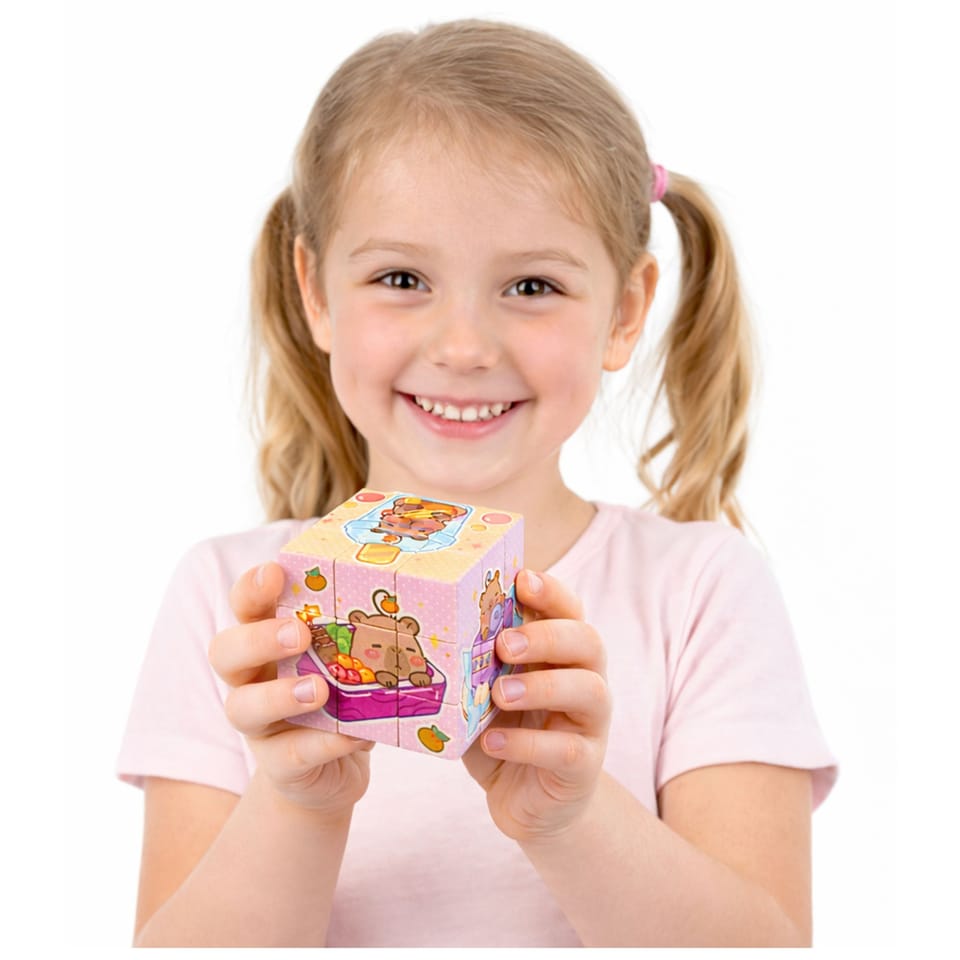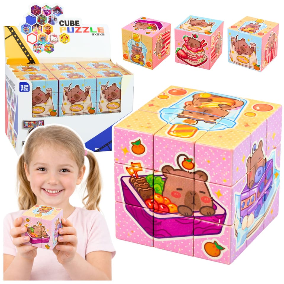 Kostka układanka logiczna z motywem kapibary to edukacyjna zabawka stworzona z myślą o najmłodszych dzieciach. Kolorowe ilustracje oraz sympatyczny motyw kapibary przyciągają uwagę i zachęcają do zabawy, jednocześnie wspierając rozwój poznawczy dziecka. Zabawka polega na obracaniu i dopasowywaniu elementów kostki tak, aby ułożyć spójne obrazki na każdej ze ścian.