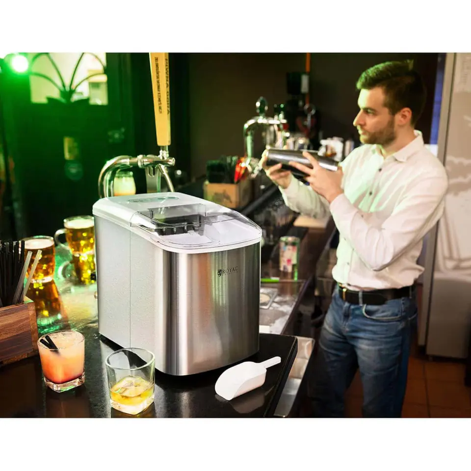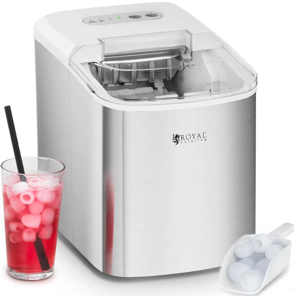 Kostkarka do lodu marki Royal Catering powala przyrządzić mrożone kawy, herbaty, smoothie, drinki alkoholowe, sorbety oraz napoje typu slush. Urządzenie pozwala wyprodukować 9 małych kostek w ciągu 6 minut. Pozwala także na wybór spośród dwóch rozmiarów i kształtów lodu. Kostkarka wytwarza kostkę lodu o okrągłym kształcie z cylindrycznym otworem w środku. Panel kontrolny pozwala na łatwą obsługę sprzętu. Wbudowane kontrolki wskazują brak wody a także konieczność opróżnienia pojemnika. Konstrukcja urządzenia wykonana została ze stali nierdzewnej oraz z ABS. Gumowe nóżki zapewniają stabilność oraz minimalizują wibracje. Przezroczyste drzwi zapewniają łatwy dostęp do pojemnika na lód. W zestawie znajduje się szufelka oraz taca.