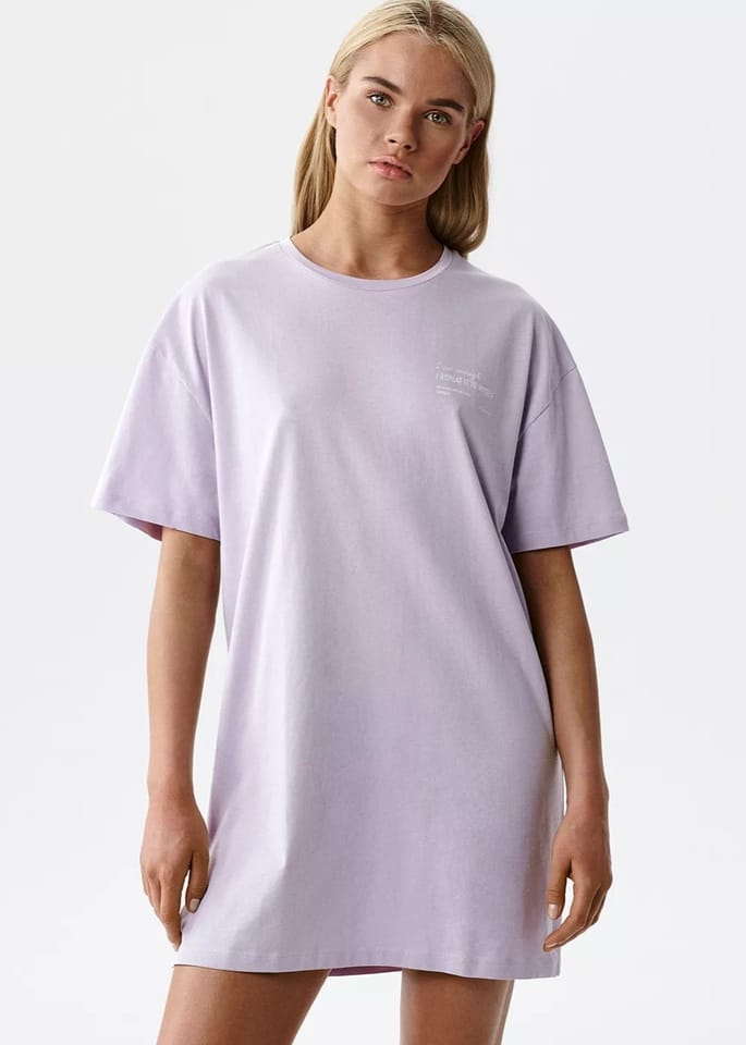 Koszula nocna ma luźny krój zapewniający swobodę ruchów i komfort zarówno podczas snu, jak i domowego wypoczynku. Klasyczny, okrągły dekolt oraz krótkie rękawy podkreślają jej ponadczasowy charakter. Modelka ma 177 cm wzrostu i rozm.S.Skład:100% bawełna.