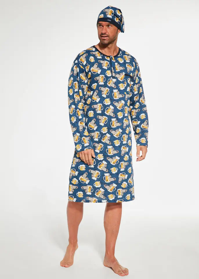 Koszula nocna męska z długim rękawem wykonana z wysokiej jakości bawełna. Dekolt półokrągły, zapinana na trzy guziczki. Do kompletu szlafmyca. Skład: 100% bawełna.