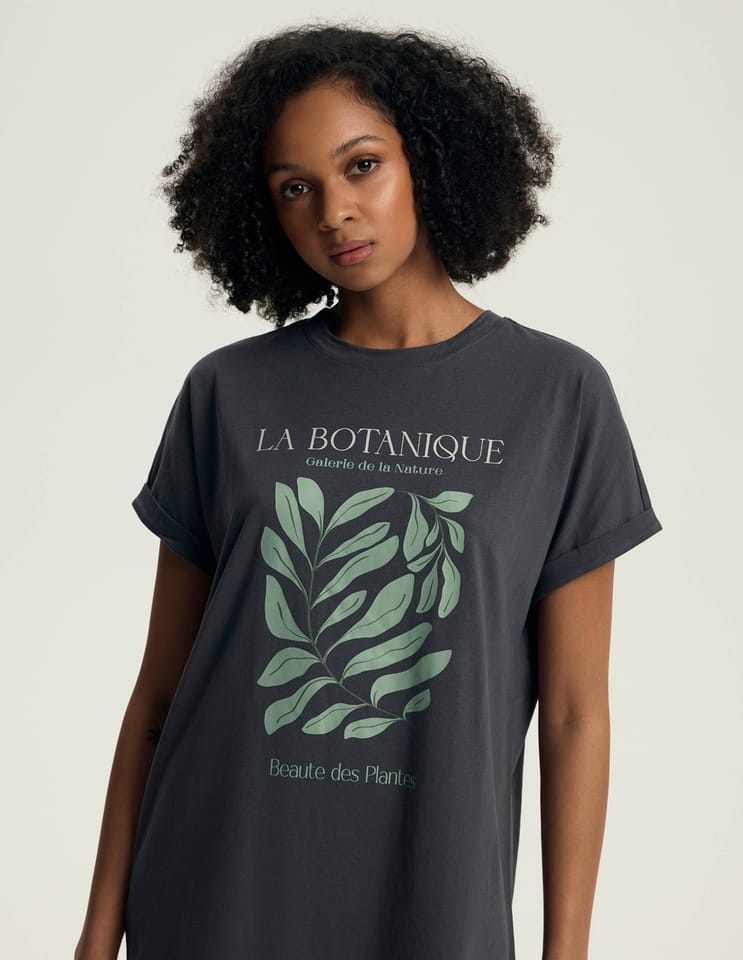 Bawełniana koszula damska z krótkim rękawem. Przód ozdobiony roślinnym motywem, dekolt półokrągły, długość przed kolano. Skład: 100% bawełna.