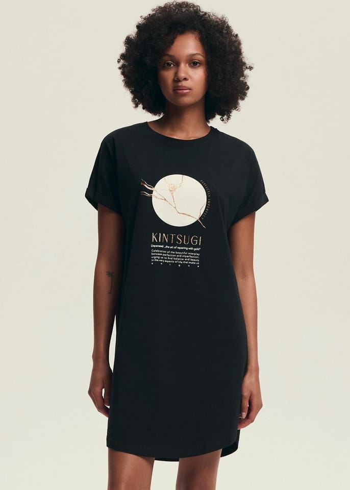 Bawełniana koszula damska z krótkim rękawem i okrągłym dekoltem. Przód ozdobiony nadrukiem, dół lekko zaokrąglony. Skład: 100% bawełna.