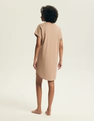 Koszula nocna damska z miękkiej bawełny o luźnym, prostym kroju ozdobiona z przodu nadrukiem. Krótki rękaw z delikatnie podwiniętym wykończeniem, zaokrąglona na dole, długość przed kolano. Skład: 100% bawełna.