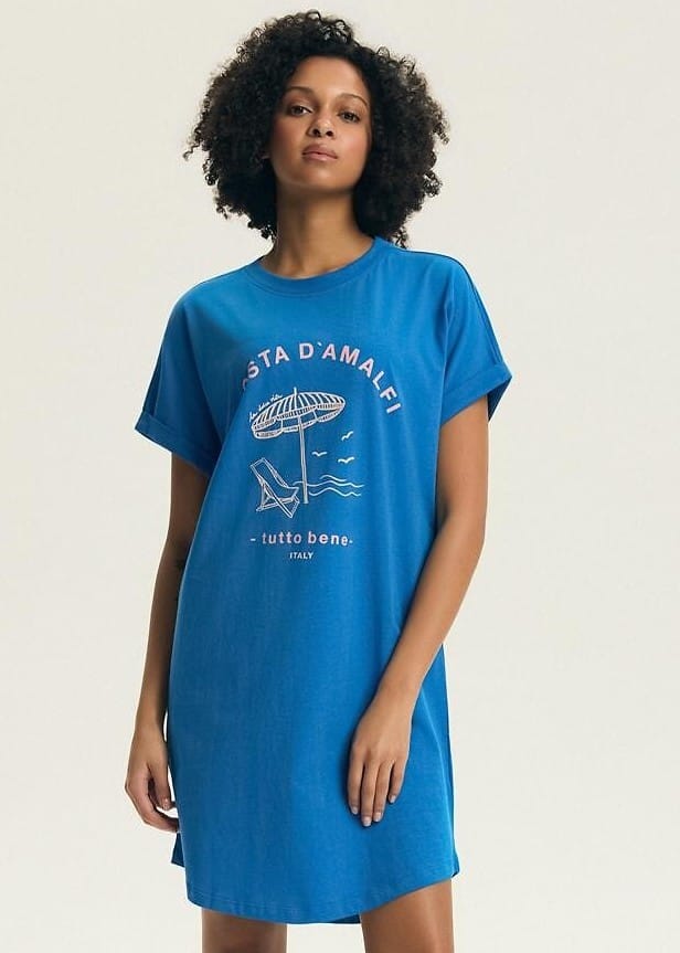 Koszula nocna damska z miękkiej bawełny o luźnym, prostym kroju ozdobiona z przodu nadrukiem. Krótki rękaw z delikatnie podwiniętym wykończeniem, długość przed kolano. Skład: 100% bawełna.