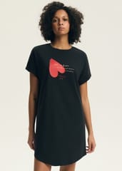 Bawełniana koszula damska ozdobiona desingiem w serduszka. Luźny, swobodny fason, krótki rękaw i okrągł dekolt i lekko zaokrąglony dół. Skład: 100% bawełna.