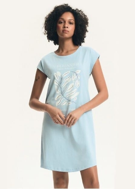 Bawełniana koszula dla kobiet ceniących wygodę, elegancję i naturalne materiały. Delikatna dla skóry, przewiewna i przyjemna w dotyku. Półokrągły dekolt, krótki rękaw, luźny fason, długość do kolan. Z przodu delikatny napis. Skład:100% bawełna.