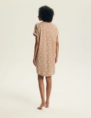 Koszula nocna damska z miękkiej bawełny o luźnym, prostym kroju. Krótki rękaw z delikatnie podwiniętym wykończeniem, zaokrąglona na dole, długość przed kolano. Skład: 100% bawełna.