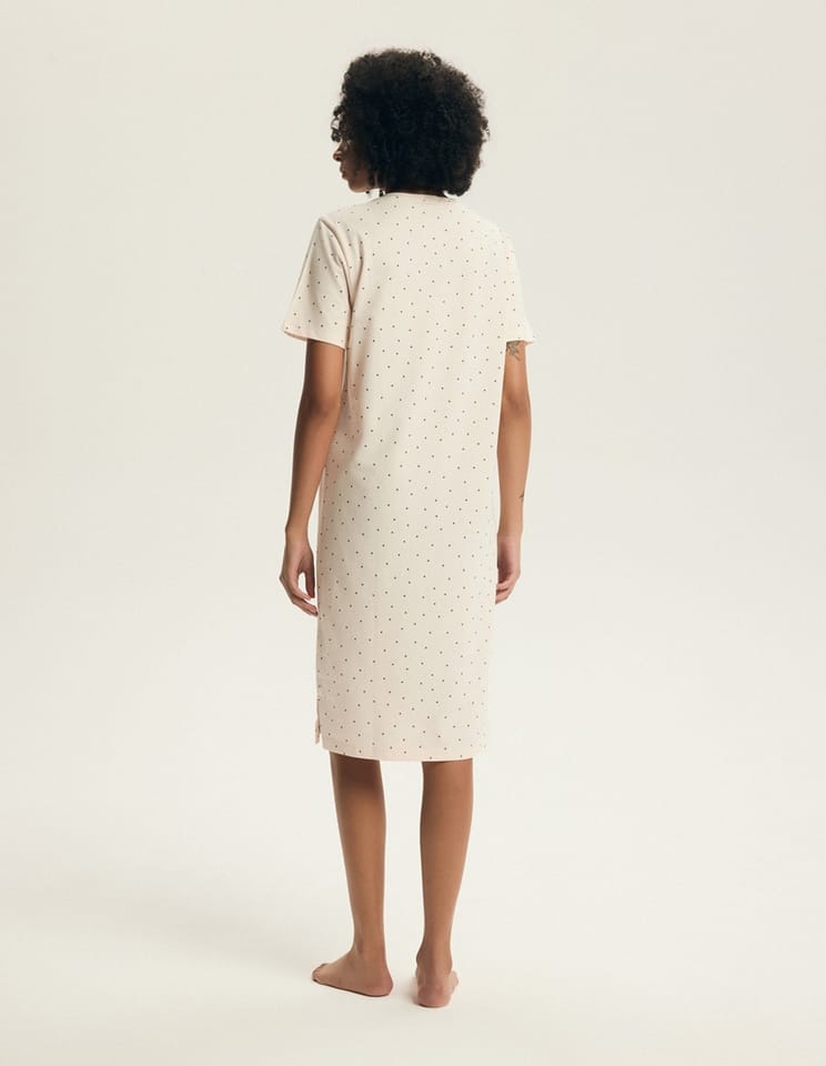 Bawełniana koszula dla kobiet ceniących wygodę, elegancję i naturalne materiały. Delikatna dla skóry, przewiewna i przyjemna w dotyku. Półokrągły, rozpinany dekolt, krótki rękaw, luźny fason, długość za kolano. Skład:100% bawełna.