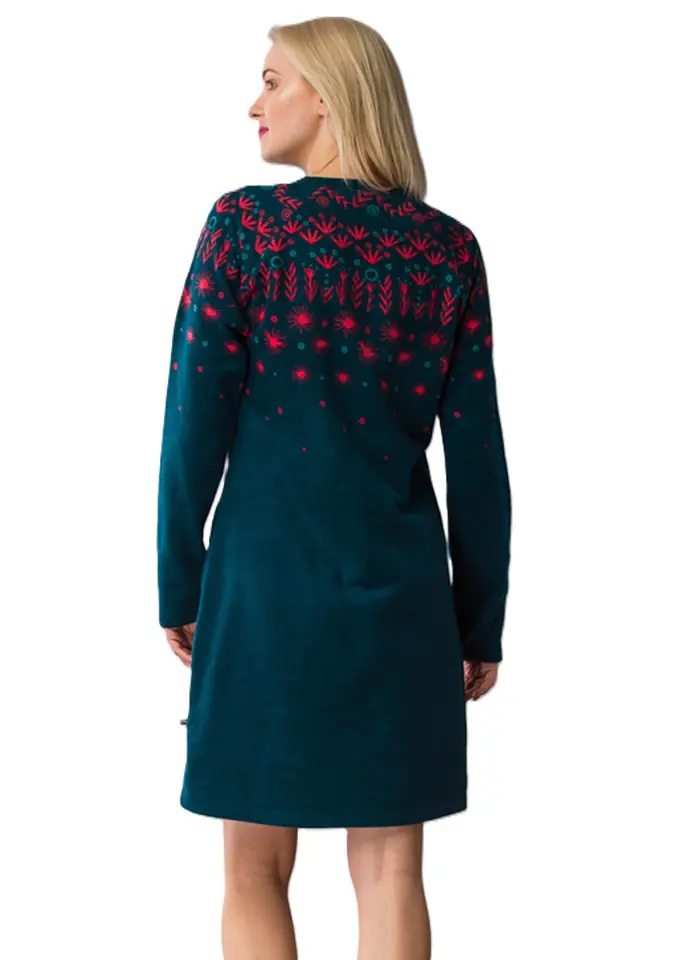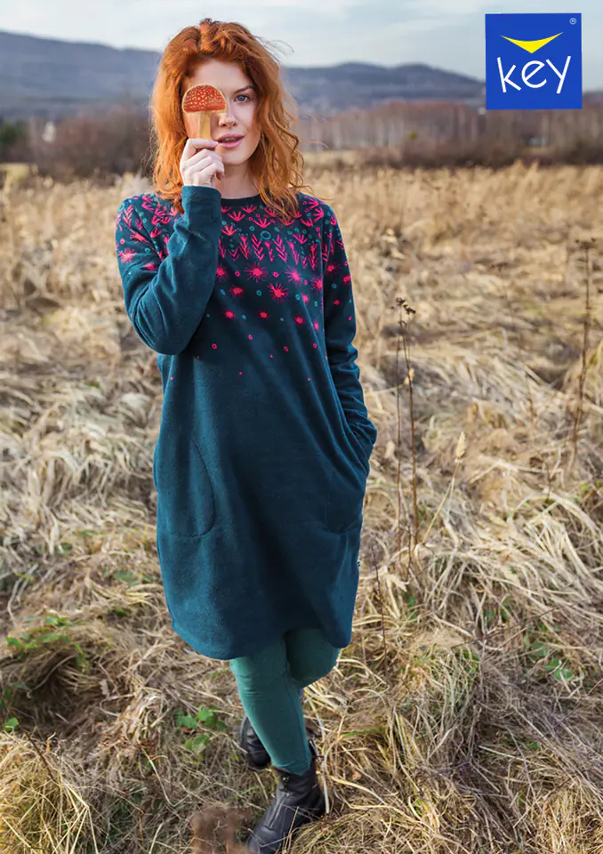 Ciepła koszula nocna wykonana z miekkiej dzianiny polarowej. Delikatny wzór w kontrastującym kolorze. Długi rękaw, na biodrach wygodne kieszenie. Skład: 100% poliester.