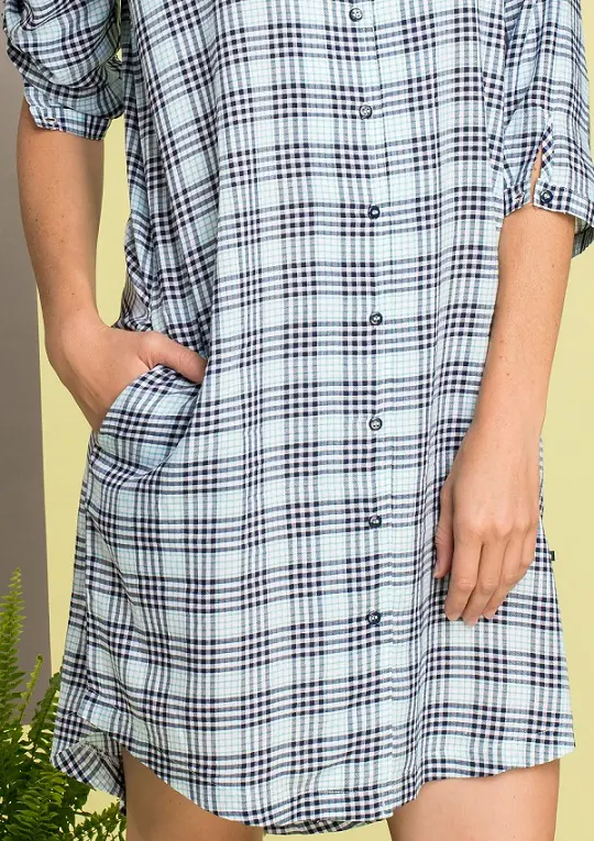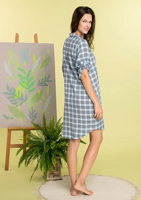 Koszula damska nocna w kratę z kołnierzykiem. Luźny wygodny krój z lekko wydłużonym tyłem, zapinana na guziki. Rękawy o długości 7/8 z troczkami do regulacji długości. Skład: 100% wiskoza.