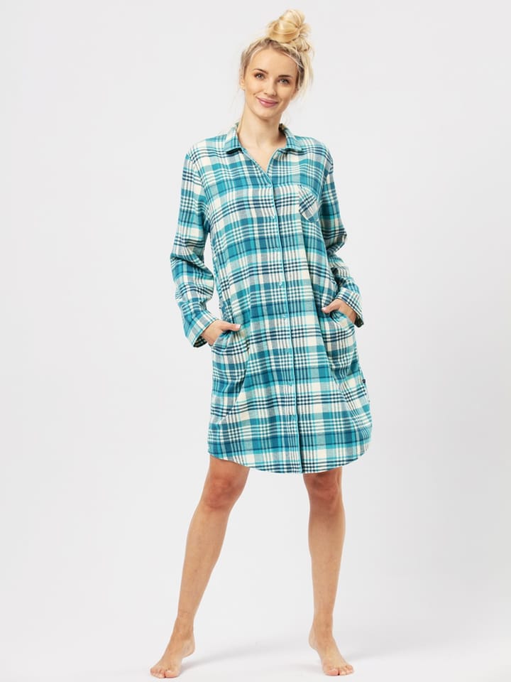 Koszula damska nocna w kratę z kołnierzykiem. Luźny wygodny krój, zapinana na guziki. Rękawy długie.