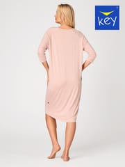 Koszula nocna z wysokiej jakości delikatnej wiskozy, która jest przewiewna, miękka i doskonale chłonie wilgoć. Luźny, wygodny fason, rękaw 3/4, długość do kolan, tył lekko wydłużony. Skład: Wiskoza 95%, Elastan 5%.