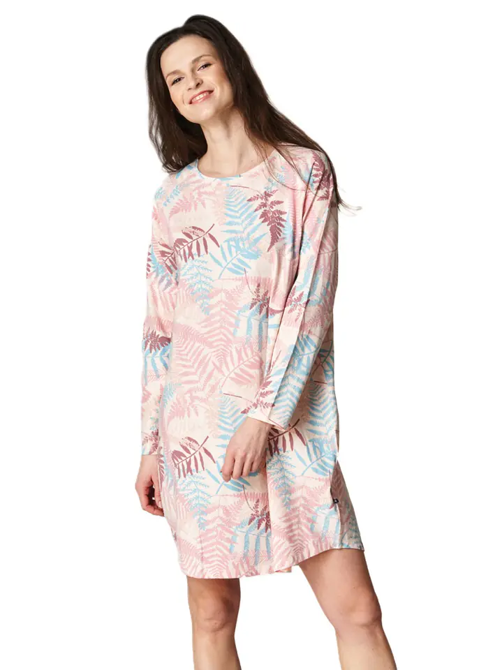 Koszula nocna wykonana z wysokiej jakości bawełny. Wzorzysty, pastelowy wzór. Luźny krój, długi rękaw. Skład: 95% bawełna, 5% elastan.