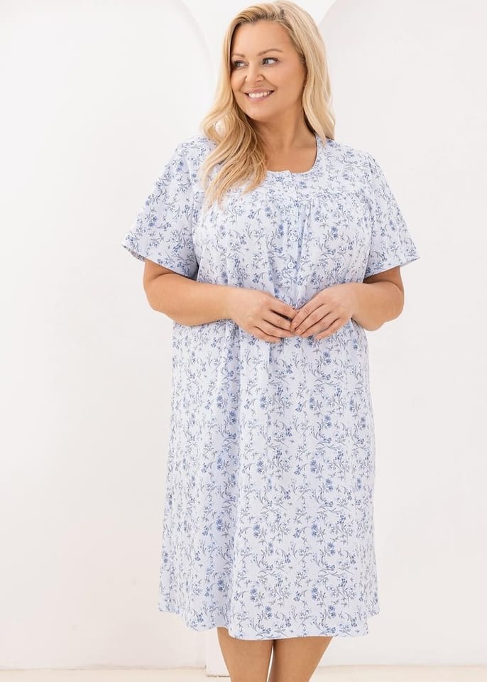 Koszula damska z wysokiej jakości bawełny,w delikatny wzorek, która jest miękka i przyjemna dla ciała. Dekolt zapinany na guziczki, karczek delikatnie marszczony, krótki rękaw. Skład: 100% bawełna.