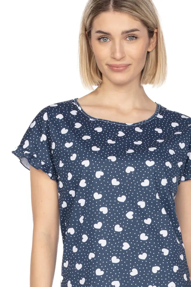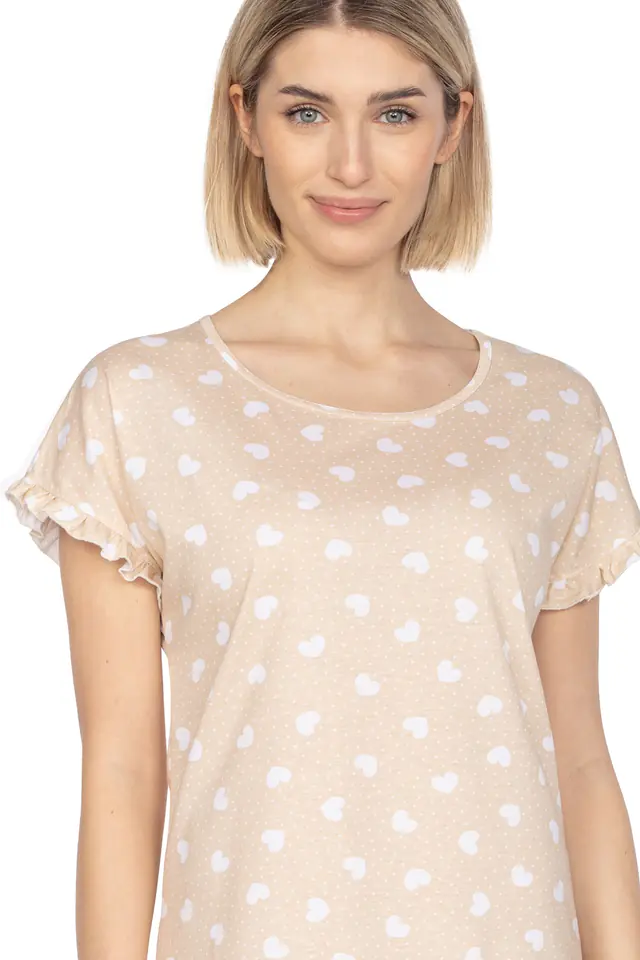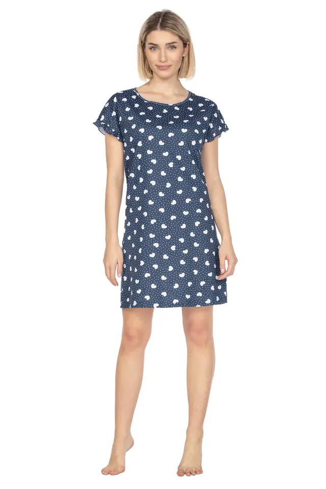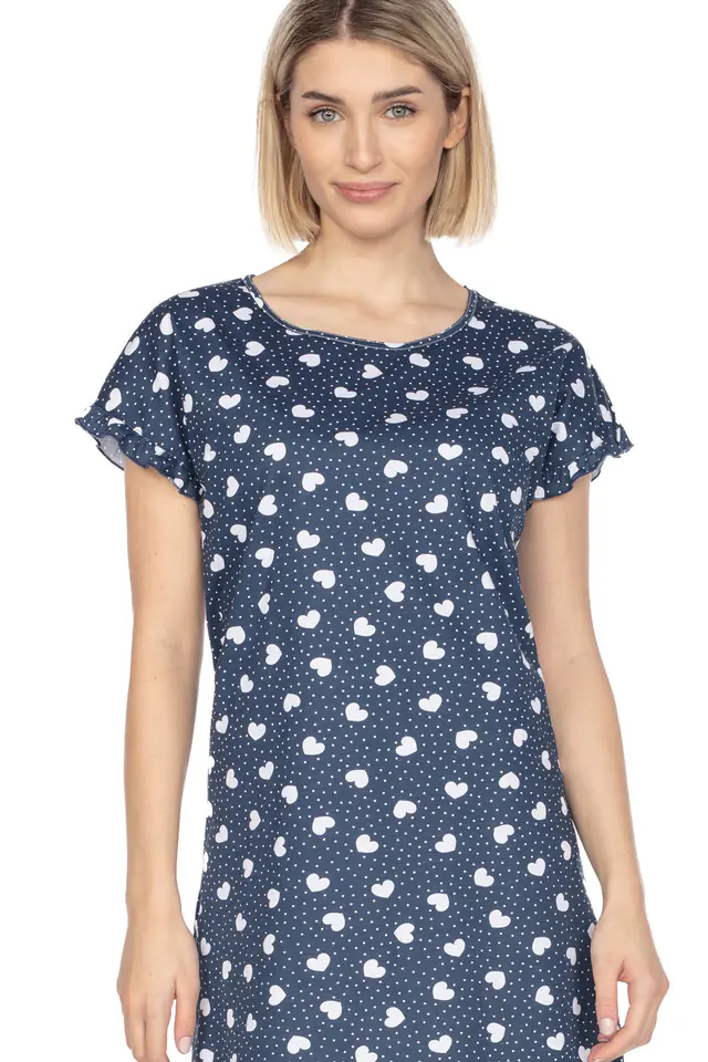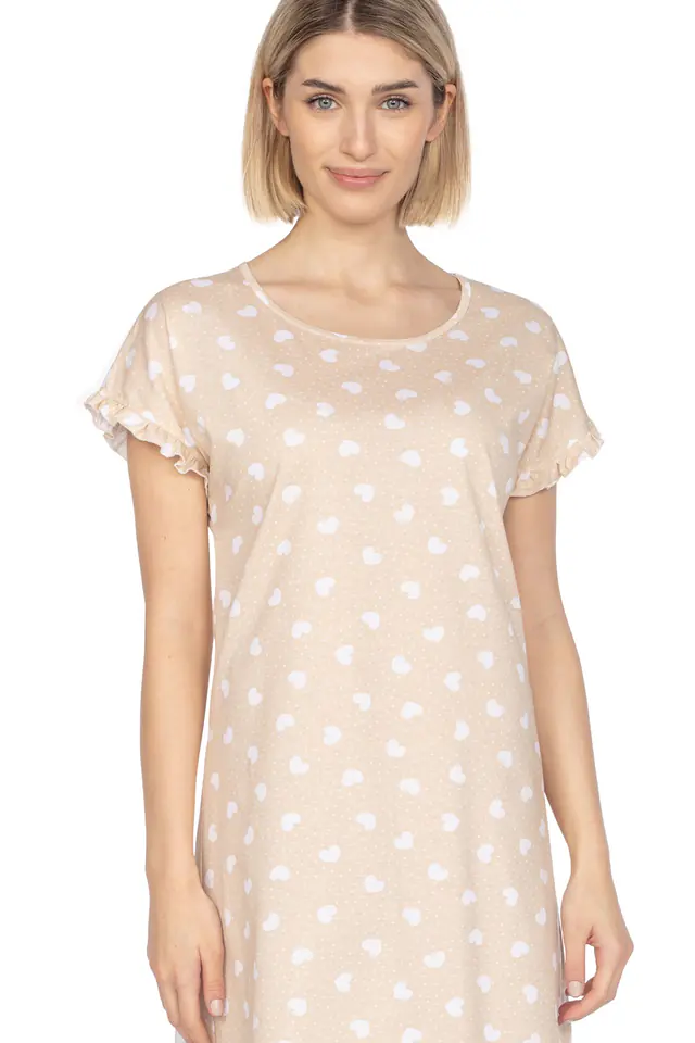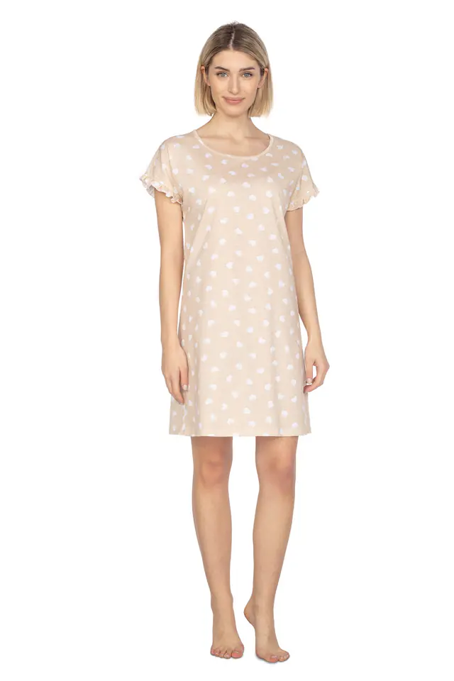 Bawełniana koszula damska z krótkim rękawem zakończonym falbanką. Długość przed kolano. Skład: 100% bawełna.