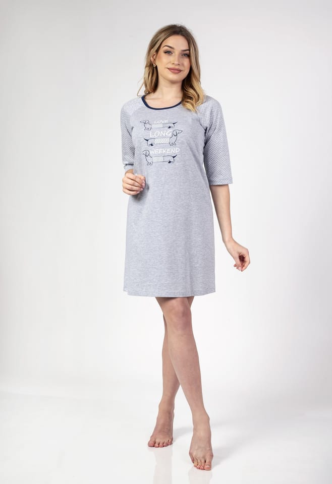 Koszula damska wykonana z przyjemnej dla ciała bawełny. Dekolt półokrągły, ozdobiony kontrastującą lamówką, z przodu ozdobny nadruk. Rękaw o długości 3/4, długość przed kolano. Skład: 100% bawełna.