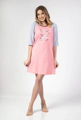 Koszula damska wykonana z przyjemnej dla ciała bawełny. Dekolt półokrągły, ozdobiony kontrastującą lamówką, z przodu ozdobny nadruk. Rękaw o długości 3/4, długość przed kolano. Skład: 100% bawełna.