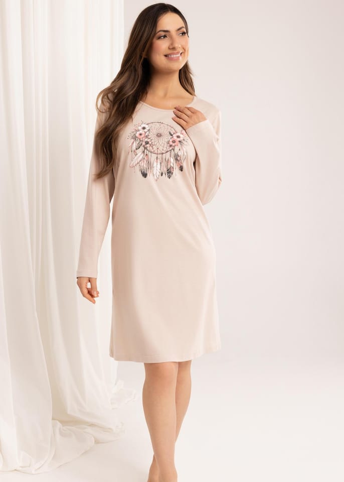Bawełniana koszula damska z długimi półokrągłym dekoltem, przód ozdobiony nadrukiem. Długość przed kolana. Skład: 100% bawełna.