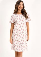 Bawełniana koszula damska w kółka i drobne kropki. Przyjemna w dotyku, miękka i elastyczna co zapewnia komfort przez całą noc nie krępując ruchów. Dekolt półokrągły, krótki rękaw, długość przed kolana. Skład: 100% bawełna.