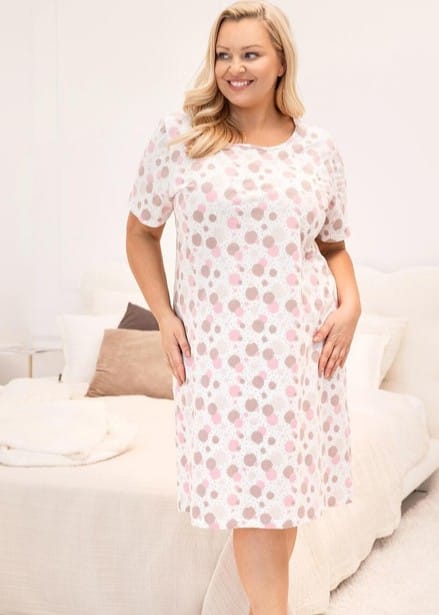 Bawełniana koszula damska w kółka i drobne kropki. Przyjemna w dotyku, miękka i elastyczna co zapewnia komfort przez całą noc nie krępując ruchów. Dekolt półokrągły, krótki rękaw, długość przed kolana. Skład: 100% bawełna.