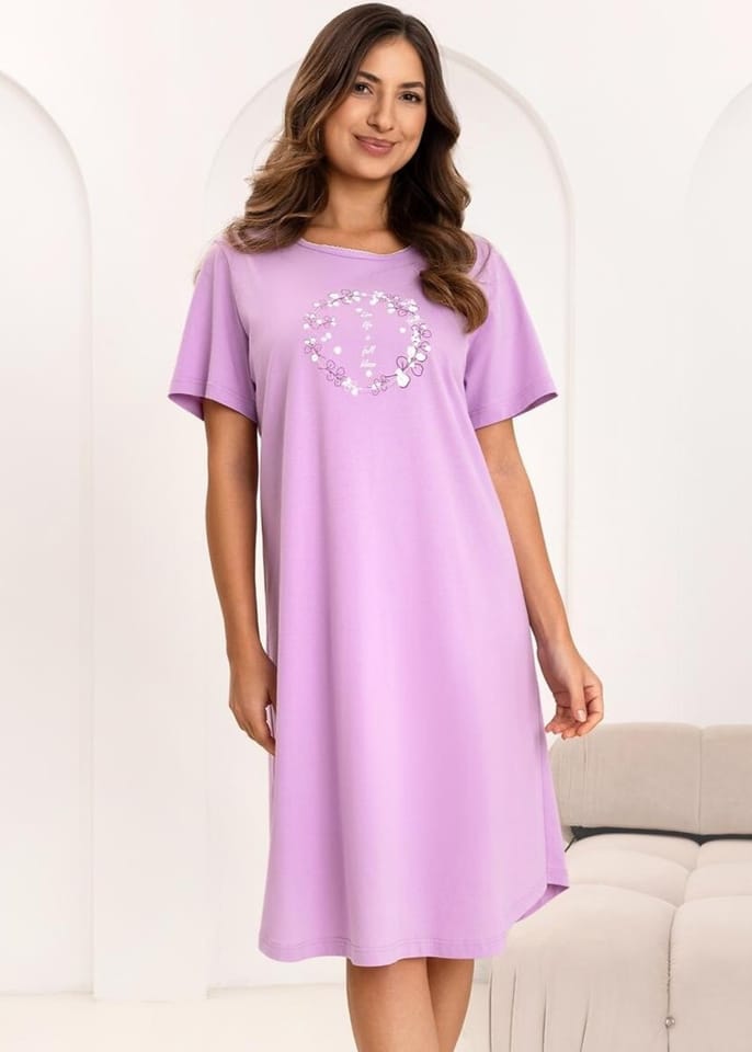 Bawełniana koszula damska z przódem ozdobionym nadrukiem. Przyjemna w dotyku, miękka i elastyczna co zapewnia komfort przez całą noc nie krępując ruchów. Dekolt półokrągły, krótki rękaw, długość przed kolana. Skład: 100% bawełna.
