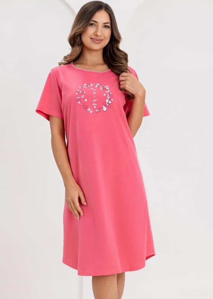 Bawełniana koszula damska z przódem ozdobionym nadrukiem. Przyjemna w dotyku, miękka i elastyczna co zapewnia komfort przez całą noc nie krępując ruchów. Dekolt półokrągły, krótki rękaw, długość przed kolana. Skład: 100% bawełna.