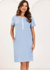 Bawełniana koszula damska, jednolita. Przyjemna w dotyku, miękka i elastyczna co zapewnia komfort przez całą noc nie krępując ruchów. Dekolt półokrągły -rozpinany,na biodrach kieszenie, krótki rękaw, długość przed kolana. Skład: 100% bawełna.