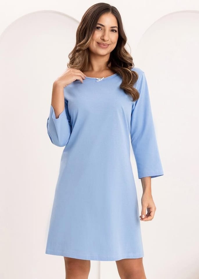 Koszula o luźnym fasonie zapewnia pełną swobodę ruchów i komfort noszenia. Dekolt półokrągły z ozdobnym obszyciem i kokardką, rękaw 3/4, długość przed kolana. Skład: 100% bawełna.