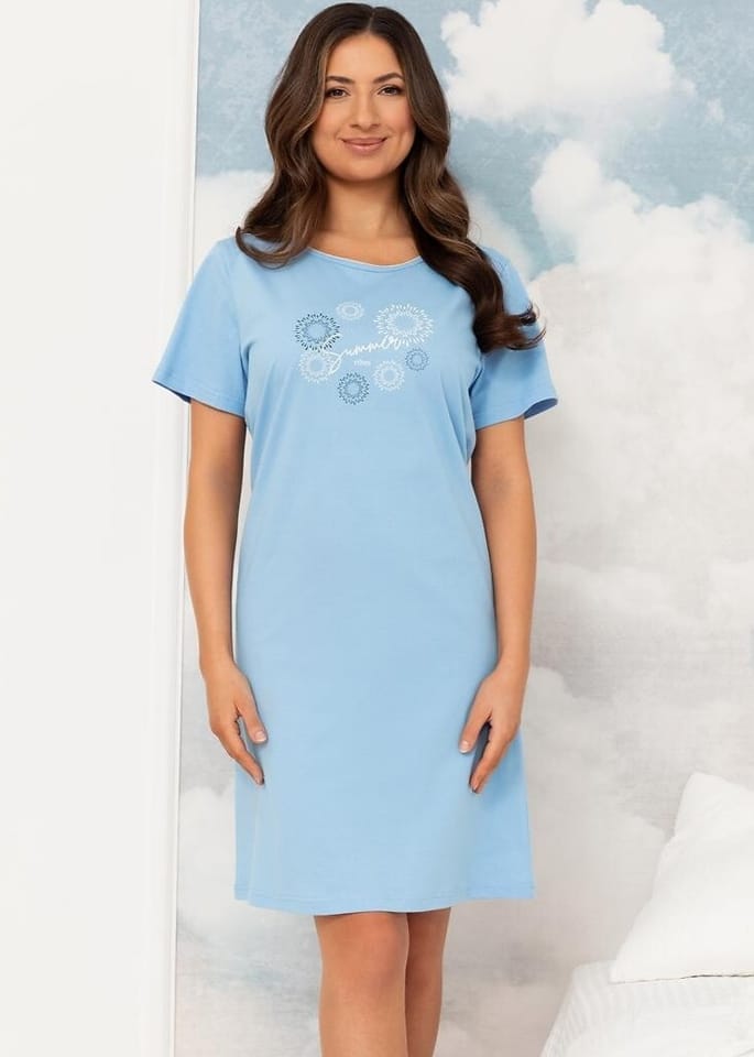 Koszula damska o luźnym kroju, która delikatnie układa się na sylwetce, nie krępując ruchów. Krótki rękaw, półokrągły dekolt, długość przed kolano. Przód ozdobiony subtelnym nadrukiem. Skład: 100% bawełna.