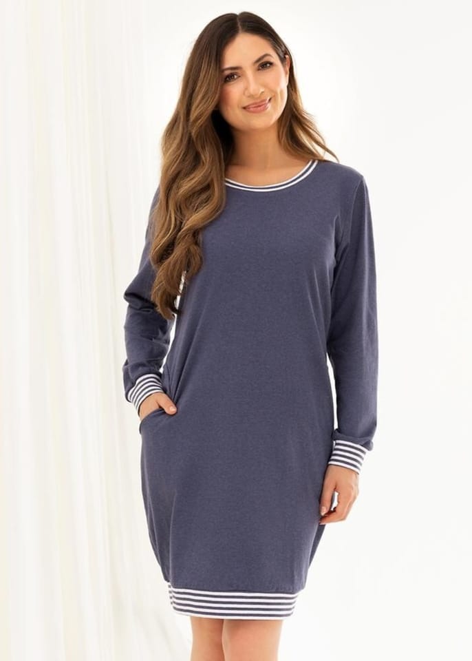 Koszula damska typu homewear z wysokiej jakości bawełny. Półokrągły dekolt, długi rękaw, na wysokości bioder wygodne kieszenie. Dekolt, mankiety i dół zakończone ściągaczem. Skład: 100% bawełna.