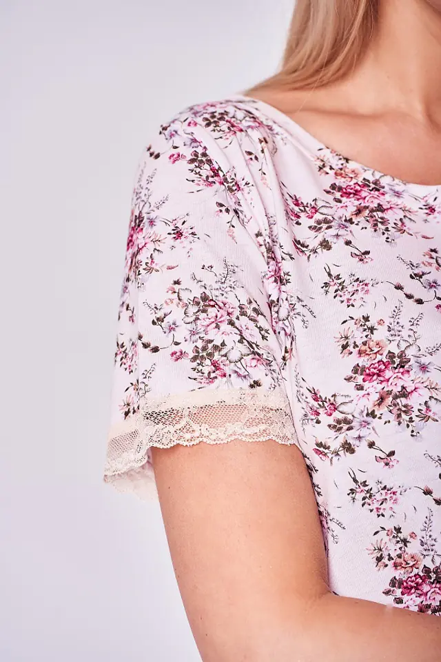 Letnia koszula damska z wysokiej jakości bawełny, zdobiona kwiatowym wzorem. K rótki rękaw obszyty koronką. Skład: 100% bawełna.