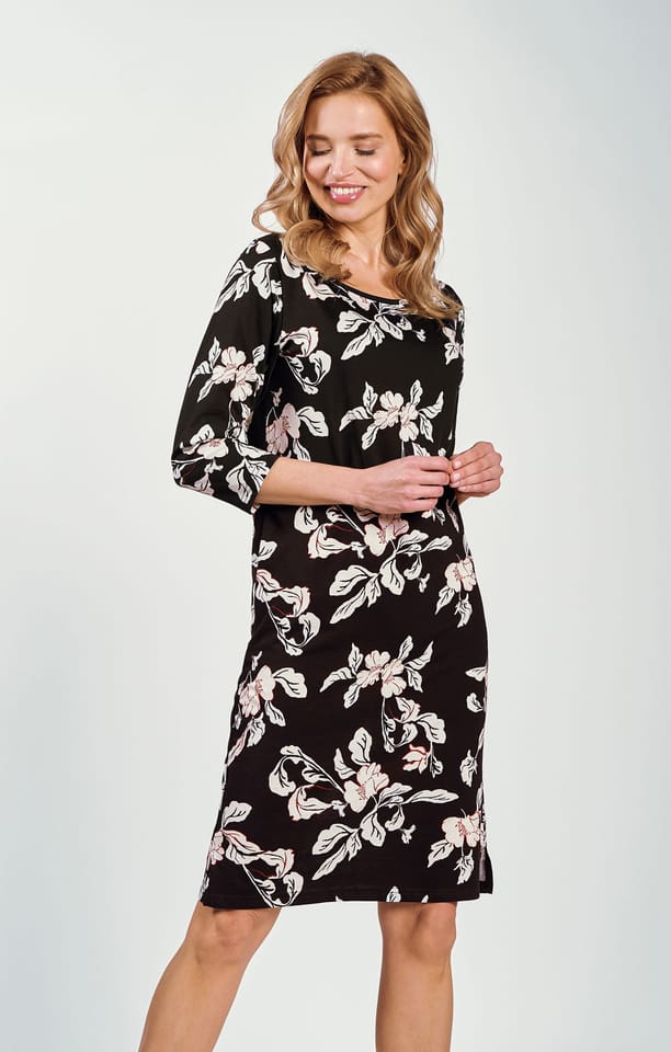 Koszula damska wykonana z wysokiej jakości bawełny ozdobiona wzorem w kwiaty. Wygodny krój do kolan, półokrągły dekolt i rękaw 3/4 .Skład: 100% bawełna.
