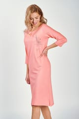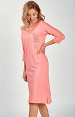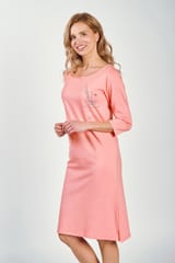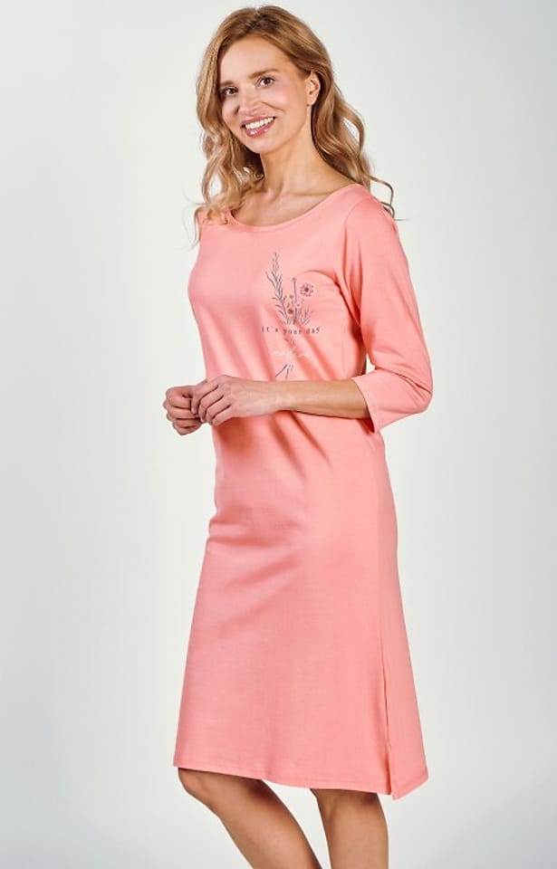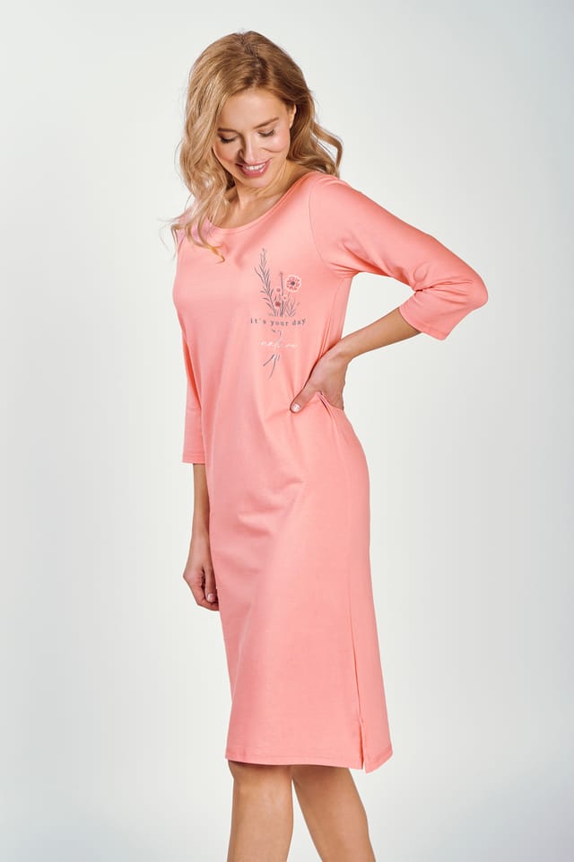 Bawełniana koszula damska ozdobiona na biuściedelikatnym motywem kwiatowym. Rękaw 3/4, dekolt półokrągły, długość do kolan. Na dole po bokach delikatne rozcięcia. Skład: 100% bawełna.