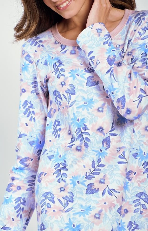 Koszula damska wykonana z wysokiej jakości bawełny interlok w kolorowe kwiaty. Wygodny krój do kolan, długi rękaw i okrągły dekolt. Skład: 100% bawełna.