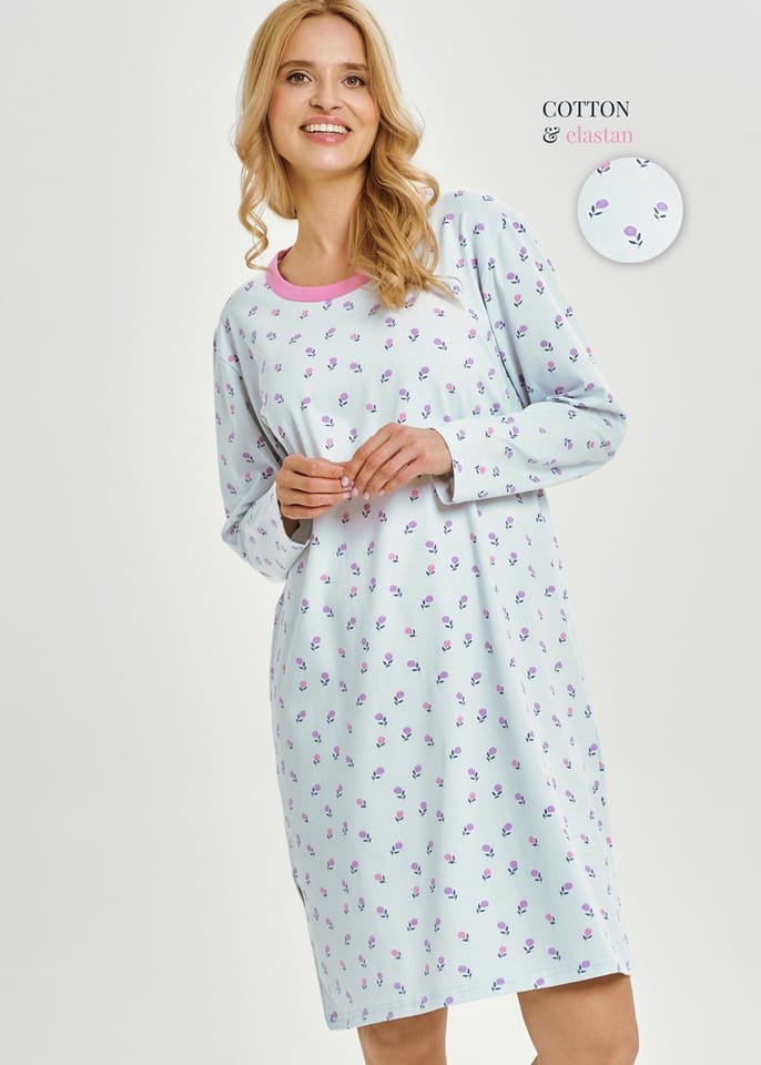 Koszula damska wykonana z miękkiej, oddychającej bawełny. Ozdobioma motywem kwiatowym, z długim rękawem i lamówką wokół szyji. Skład: 94% bawełna, 6% elastane.