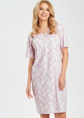 Koszula damska z wysokiej jakości bawełny całość zdobi roślinny nadruk na różowym tle. Krótki rękaw, długość przed kolano, dekolt półokrągły, zapinany na zatrzaski. Model idealny dla mamy karmiącej. Skład: 100% bawełna.