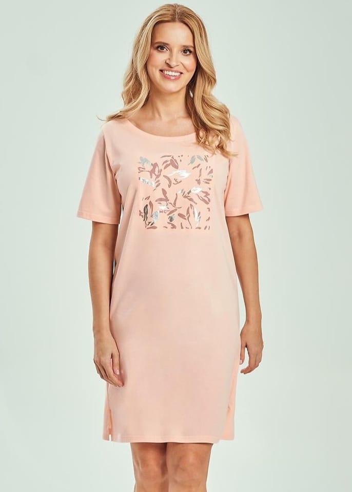 Koszula nocna z ozdobnym nadrukiem z przodu, jest miękka, oddychająca i delikatna dla skóry, co zapewnia komfortowy sen przez całą noc. Okrągły dekolt, krótki rękaw, długość do kolan a u dołu małe rozporki. Skład: 100% bawełna.