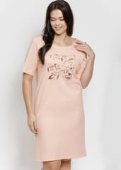 Koszula nocna z ozdobnym nadrukiem z przodu, jest miękka, oddychająca i delikatna dla skóry, co zapewnia komfortowy sen przez całą noc. Okrągły dekolt, krótki rękaw, długość do kolan a u dołu małe rozporki. Skład: 100% bawełna.