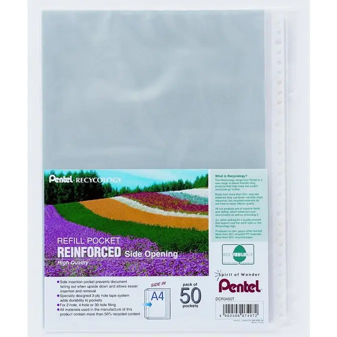 KOSZULKA NA DOKUMENTY otwierana z boku_Refill pocket reinforced side opening__- System bocznego otwierania koszulki zabezpiecza dokumenty przed wypadaniem_- Specjalna 3-warstwowa taśma zwiększająca trwałość koszulki_- Do użytku w 2, 4 a nawet 30-ringowych segregatorach_- Wykonana w ponad 50% z surowców wtórnych