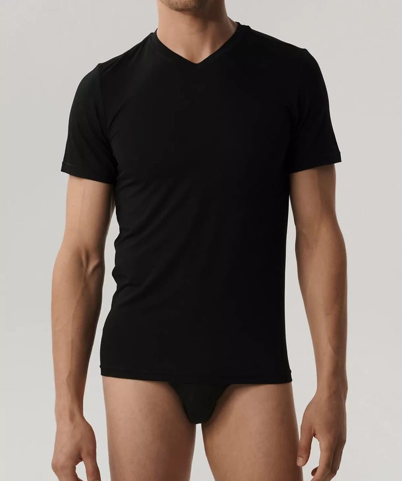 T-shirt męski wykonany z mięciutkiego bambusa, dzianina posiada właściwości termoregulacyjne. Krótki rękaw, dekolt w szpic. Skład: 95% bambus, 5% elastan.