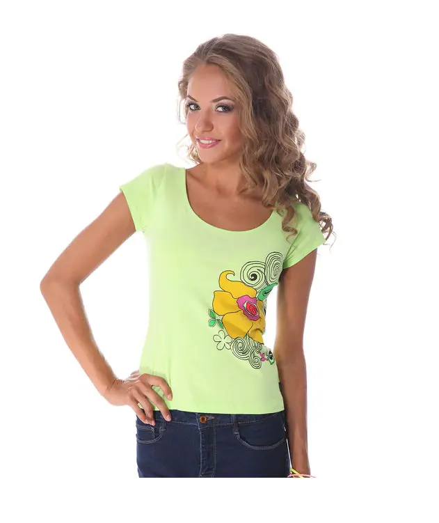 Koszulka damska z modnym nadrukiem. Wykonana z bawełny (95%), z dodatkiem elastanu (5%), który zapewnia idealne dopasowanie do sylwetki.